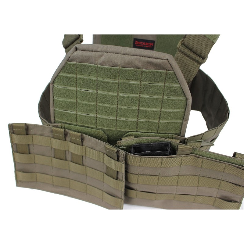 En dessous, il y a d'autres boucles MOLLE pour attacher des chargeurs et des sacs multi-usages. À l'extérieur, une sangle verticale pour attacher des câbles et d'autres objets est fixée à gauche et à droite.